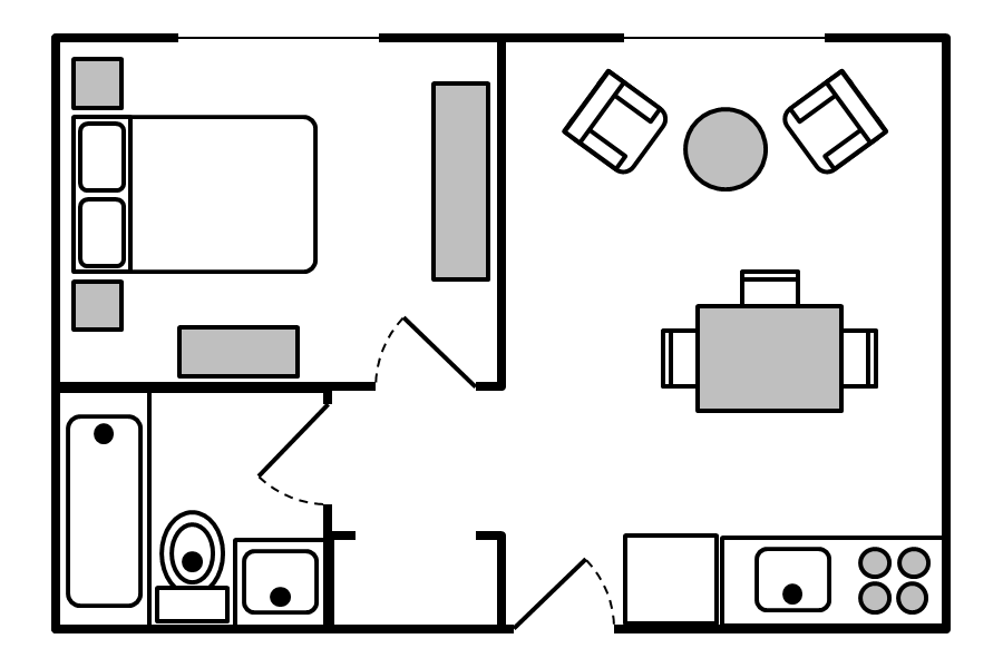 [X is a room.] = X is one of several places inside a big building like this: People in one place inside the building cannot see into other places inside the building because there are solid parts of the building between these places.